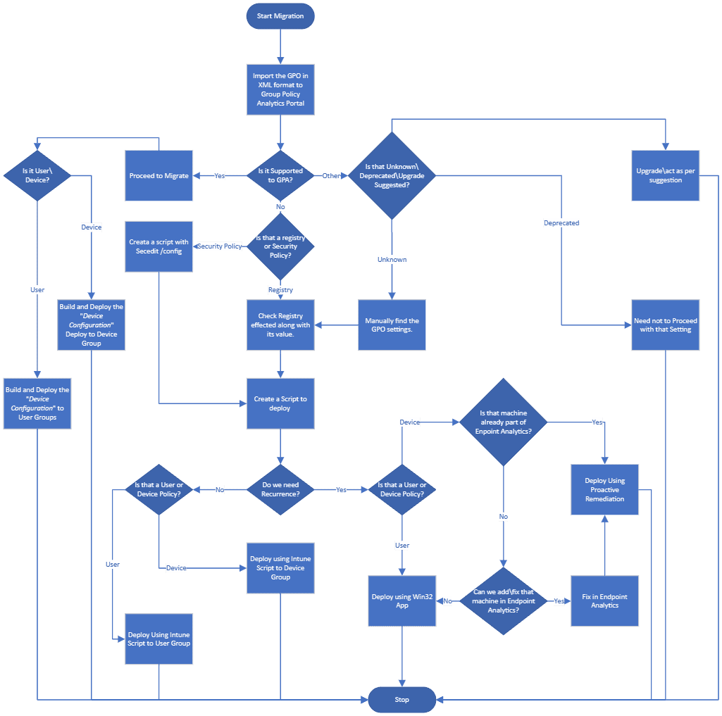 Fresh policies are recommended to start from Intune directly. However, when we talk about migrating existing policies, a decision-making flow chart is needed. Below is one such flow chart to refer.