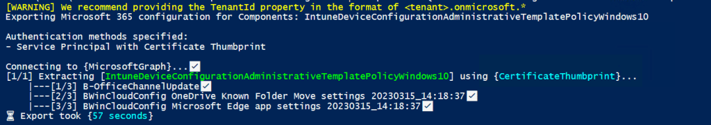 Export-M365DSCConfiguration -Components @("IntuneDeviceConfigurationAdministrativeTemplatePolicyWindows10") -ApplicationId $ApplicationId -CertificateThumbprint $CertificateThumbprint -TenantId $TenantId