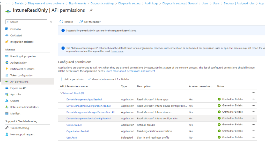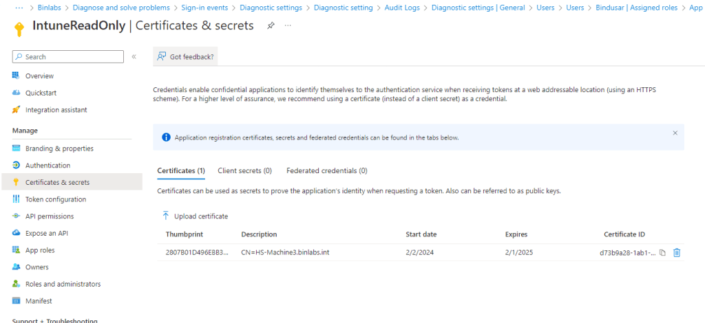 Once done, we are good to run the script. During execution, it will be prompting for application ID and Thumbprint of certificate we uploaded. Application ID will can be found under overview section of application and thumbprint will be under certificates and secrets section. TenantID here is referring to domain name. In my case, it will be Binlabs.in. I am also using -Path parameter as well to store the backup at desired location.